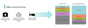 Essentially, a 104% valued activity target was set to avoid an achievement of the 110% target exclusively through reducing outpatient follow-ups and completing more referrals in primary care. Tariffs are applied to obtain valued activity, so that inpatient elective pathways are far more valuable than day cases and outpatients. In our client’s case, despite excelling at completing outpatient pathways, they were unable to meet the targets due to the value-weighting placing more importance on inpatient activity.
