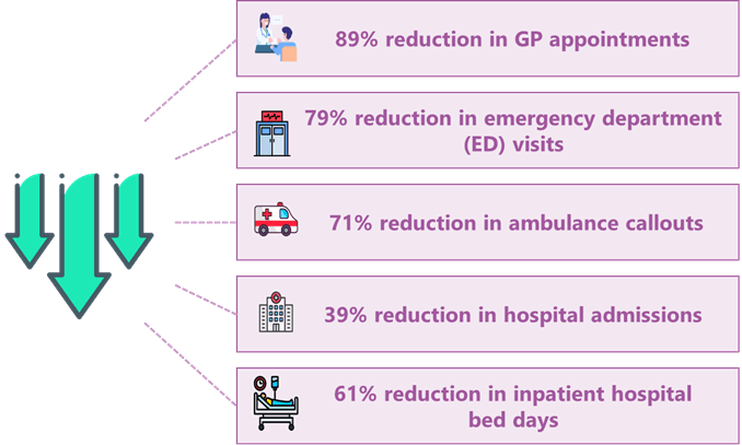 - Ambulance callouts reduced by 71% (5 callouts avoided).