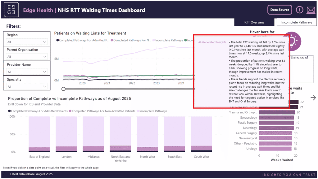 To demonstrate how this technology can augment dashboards, we have created a new AI capability for our publicly available NHS Data Analytics and Software Hub (DASH). The underlying model automatically analyses the referral-to-treatment trends, uses contextual information, such as the NHS ten-year plan priorities and flags where targeted intervention is needed most.