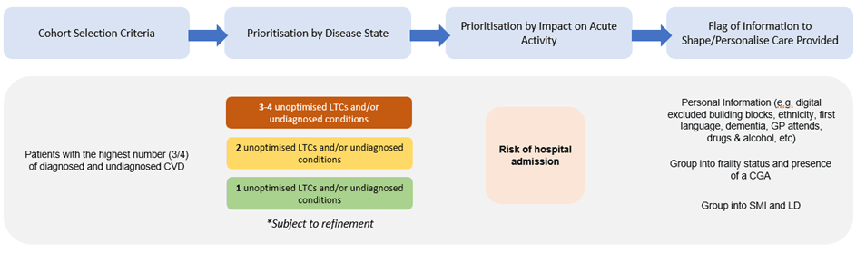 Lewisham and Greenwich NHS Trust (LGT) have been ahead of the curve in the design and set-up of Integrated Neighbourhood Teams (INT), with their novel pilot expected to go live in 2025. A key aspect of their approach is the utilisation of their population health management tool, HealtheIntent. The LGT Population Health Team use the tool, which brings together key population health datasets, to proactively risk-stratify patients and identify those with the greatest need. The diagram below shows how these individuals were identified for the pilot.