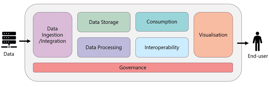 The diagram below provides a high-level summary of the core requirements of an effective tool, considering the full lifecycle from data ingestion and storage to processing, consumption, interoperability, and end-user visualisation. Further details based on the specific requirements within LGT and the population health team were provided to the team.