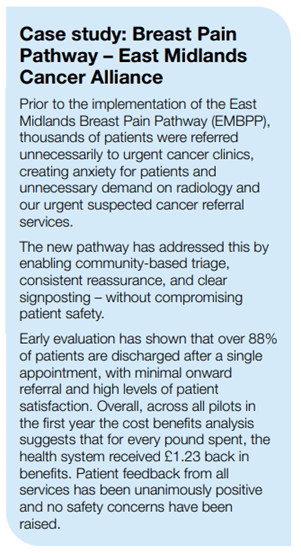 We are pleased to see that the first of these 17 case studies was the ‘East Midlands Breast Pain Pathway’ (EMBPP). Edge Health partnered with the Health Innovation East Midlands to evaluate this pathway at both an East Midlands and National scale, producing two academic papers to date, where we explored features of the successful pathways including integrated primary and secondary care, and an experienced clinician. This pathway is a genuine example of where there are tangible and genuine wins within reach being delivered across the NHS, with our evaluation showing better patient outcomes, satisfaction and a positive cost-benefit ratio. You can read our East Midlands Evaluation published paper here and our National Evaluation published paper here.