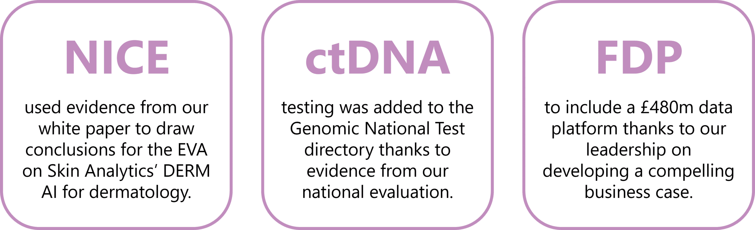 By understanding the impact of the innovation within these areas, our evaluations help successful innovation to scale at pace. They also enable NHS resources to be used in the most effective way and maximise benefits to patients and staff.