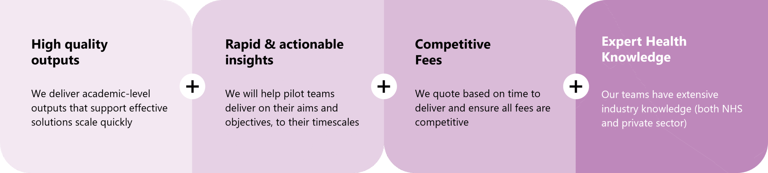 Many NHS organisations have health economics or evaluation teams. However, these teams are often under significant pressure, causing delays to the work. These delays lead to the costs of failing to effectively evaluate innovations. Our evaluation teams can support internal teams and ensure all innovation is given a high-quality, rapid evaluation to maximise their chances of success and the benefits to patients, staff and the health system.